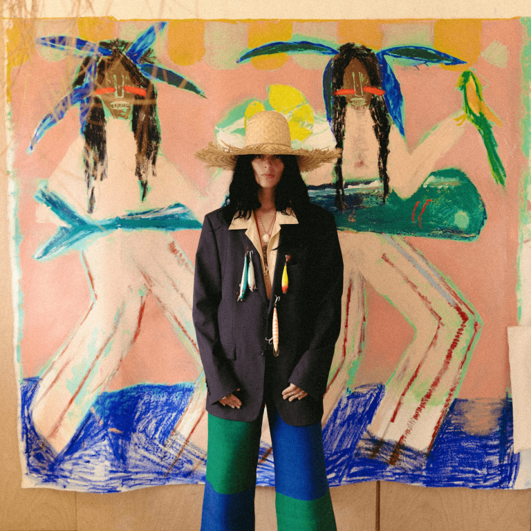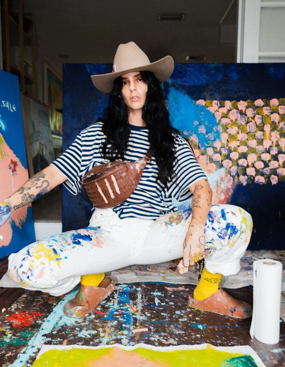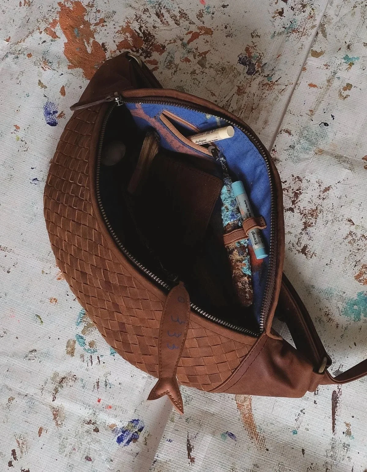 Designed with Papou’s playful spirit, this limited edition product collaboration blends freedom, creativity, and art into a limited-edition Woven Atlas Saddle Bum Bag. The bag’s lining is a one-of-a-kind print designed by Papou, and each purchase comes with a exclusive print of her painting “Sunrise In My Mouth.”